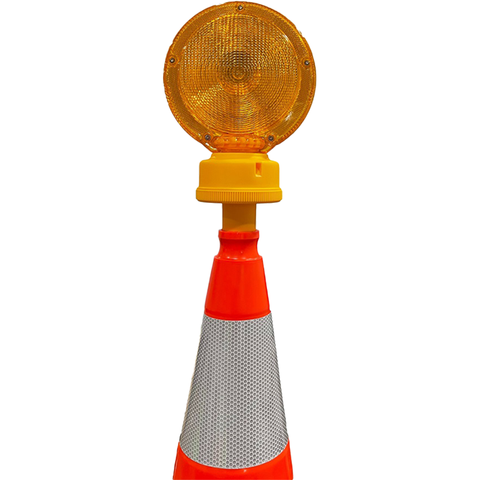 A heavy duty barricade light with double-sided amber lens that cleverly fits on top of any standard traffic cone. Type A/C flasher light functions with steady-flash-close options and has automatic daytime shut off to prolong battery life. Features a bright LED optic lens which produces 20% more light output than competitive brands. Unbreakable lens withstands high impacts and is suitable for harsh weather conditions.