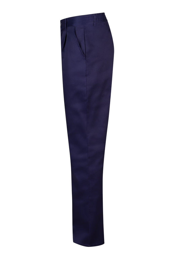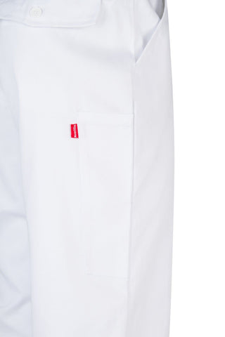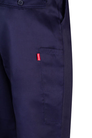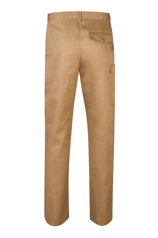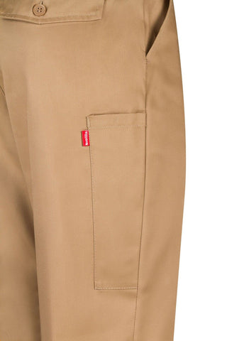 Four pockets: 2 French pockets, 1 back welt pocket, with cover flap and button, 1 tool pocket on right leg